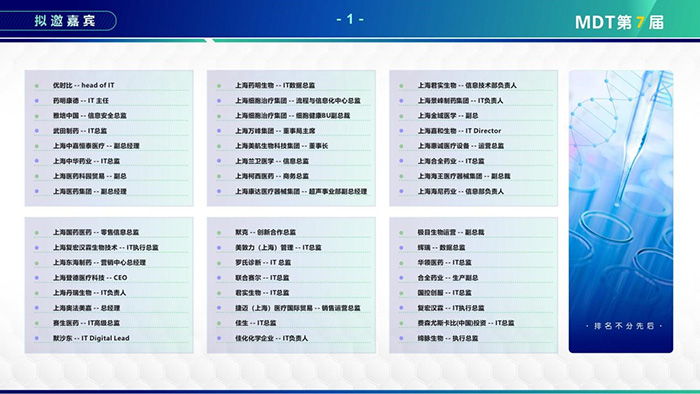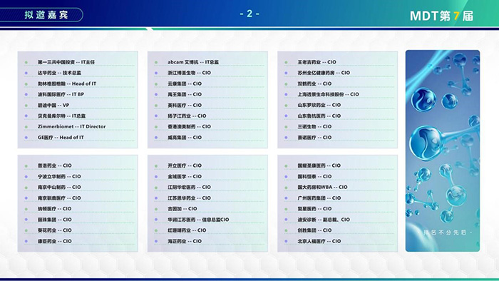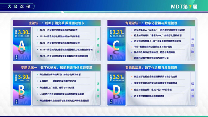 在新的市場契機下,由勤哲文化主辦的MDT 2023第七屆中國醫(yī)藥健康數(shù)字科技大會應勢而來。本次大會以“2023:加速構建數(shù)據(jù)驅動的智慧企業(yè)”為主題,將于2023年3月30-31日在上海隆重舉行,現(xiàn)場匯集350+醫(yī)藥健康行業(yè)知名企業(yè)高管、CIO、 IT負責人以及行業(yè)優(yōu)秀信息化服務商。從業(yè)界最佳實踐、技術發(fā)展趨勢、轉型價值發(fā)現(xiàn)、頭部企業(yè)案例出發(fā),多方面探討制醫(yī)藥健康企業(yè)該如何通過數(shù)字化轉型充分賦能自身成長;如何結合自身優(yōu)勢,進行數(shù)字化戰(zhàn)略布局。
