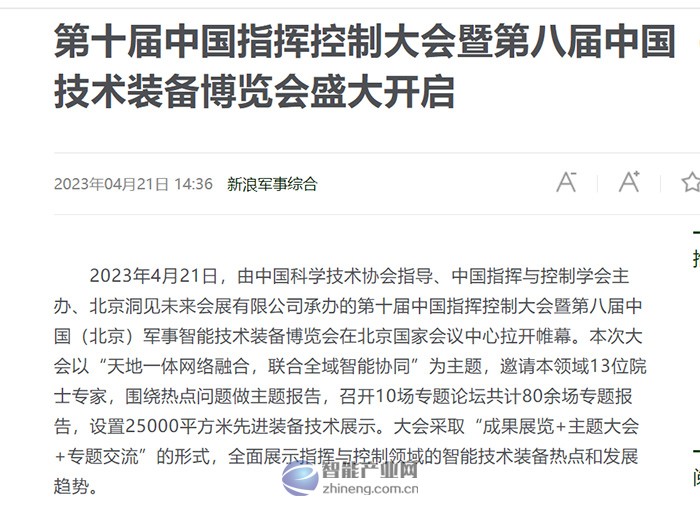 2023年4月23日,由中國指揮與控制學(xué)會主辦的第十屆中國指揮控制大會暨第八屆中國(北京)軍事智能技術(shù)裝備博覽會在北京國家會議中心完美收官!中國指揮控制大會盛況空前,專題論壇場場爆滿,軍博會吸引了央視CCTV-13、CCTV-4中文國際頻道、北京衛(wèi)視、中國網(wǎng)、光明網(wǎng)、中華網(wǎng)、新浪網(wǎng)、鳳凰網(wǎng)、中國日報、環(huán)球時報、環(huán)球網(wǎng)等新聞媒體的爭相報道。
